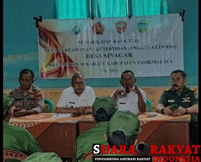 Kegiatan pelatihan peningkatan kapasitas anggota satlinmas Desa Sinagar Kecamatan Sukaratu Kabupaten Tasikmalaya tersebut bertempat di GOR milik Pemdes Sinagar., Rabu, (7/6/2023).